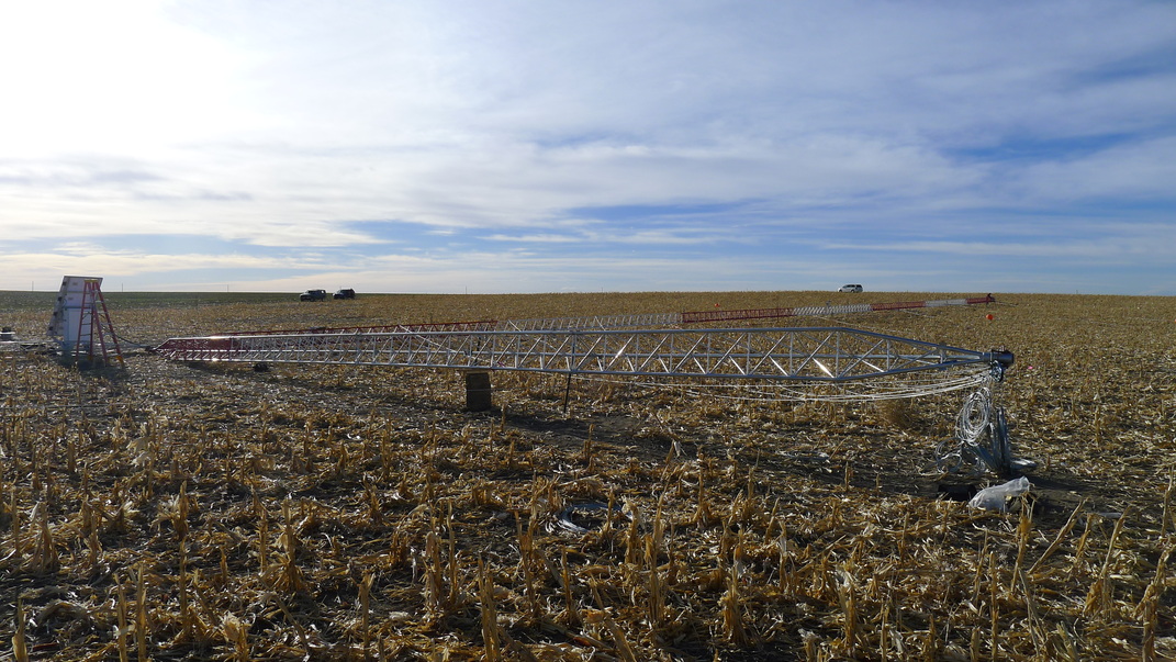 The site went from a bare cornfield to a functioning MET tower in only 6 days, with a very professional and hardworking crew of 6. The tower will only likely remain in place for a little over a year, at which point it will be decommissioned and moved to another site.