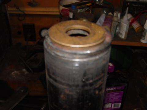 Here is the bushing assembly we make for the tower stub. Basicly its just a cap that slips into the tower a couple inches. There is a large (1") diameter hole in the top. We put that in the tower, then we put the bronze bushing (a thrust bearing, a steel washer, or plastic bushing is also fine) over that. Then we run the wire through all that and put the machine over the top.